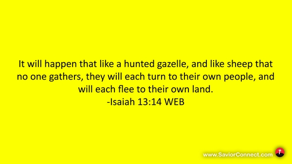 It will happen that like a hunted gazelle, and like sheep that no one gathers, they will each turn to their own people, and will each flee to their own land. -Isaiah 13:14 WEB