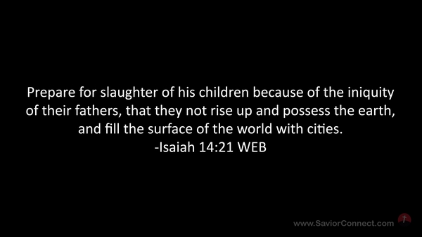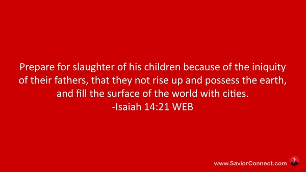 Prepare for slaughter of his children because of the iniquity of their fathers, that they not rise up and possess the earth, and fill the surface of the world with cities. -Isaiah 14:21 WEB