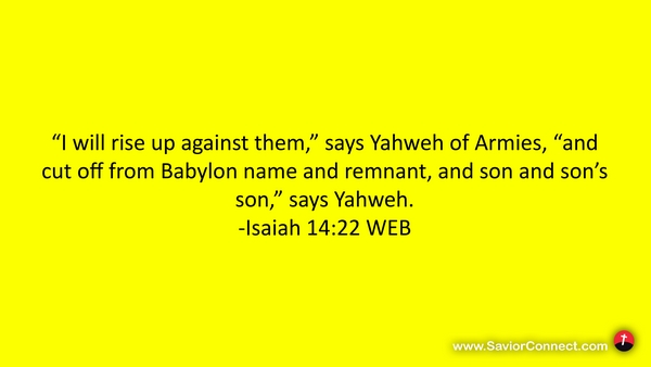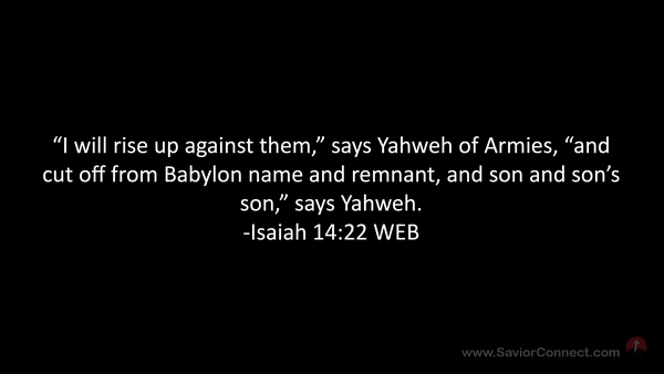 “I will rise up against them,” says Yahweh of Armies, “and cut off from Babylon name and remnant, and son and son’s son,” says Yahweh. -Isaiah 14:22 WEB