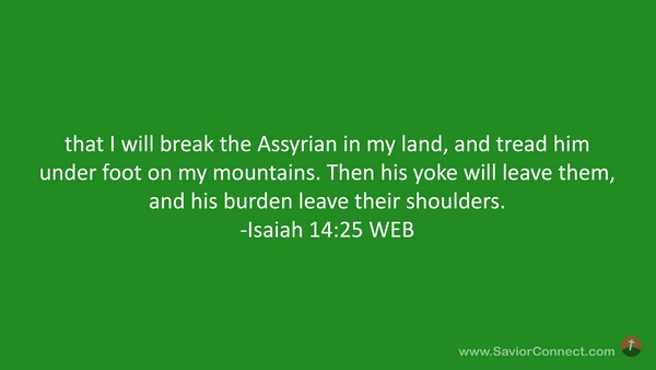 that I will break the Assyrian in my land, and tread him under foot on my mountains. Then his yoke will leave them, and his burden leave their shoulders. -Isaiah 14:25 WEB