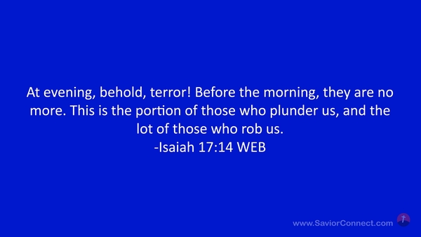 At evening, behold, terror! Before the morning, they are no more. This is the portion of those who plunder us, and the lot of those who rob us. -Isaiah 17:14 WEB