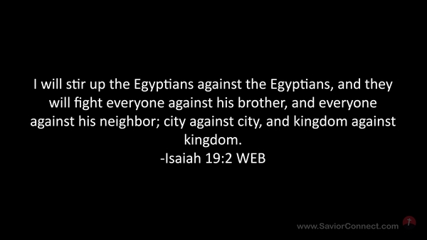 I will stir up the Egyptians against the Egyptians, and they will fight everyone against his brother, and everyone against his neighbor; city against city, and kingdom against kingdom. -Isaiah 19:2 WEB