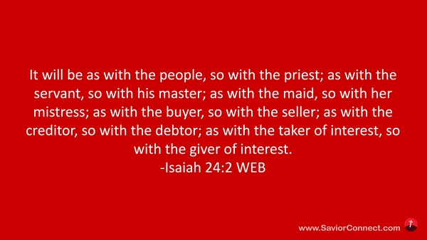 It will be as with the people, so with the priest; as with the servant, so with his master; as with the maid, so with her mistress; as with the buyer, so with the seller; as with the creditor, so with the debtor; as with the taker of interest, so with the giver of interest. -Isaiah 24:2 WEB