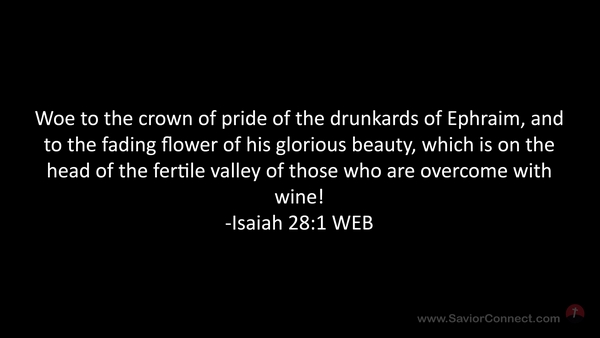 Woe to the crown of pride of the drunkards of Ephraim, and to the fading flower of his glorious beauty, which is on the head of the fertile valley of those who are overcome with wine! -Isaiah 28:1 WEB