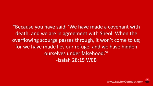 “Because you have said, 'We have made a covenant with death, and we are in agreement with Sheol. When the overflowing scourge passes through, it won’t come to us; for we have made lies our refuge, and we have hidden ourselves under falsehood.’” -Isaiah 28:15 WEB