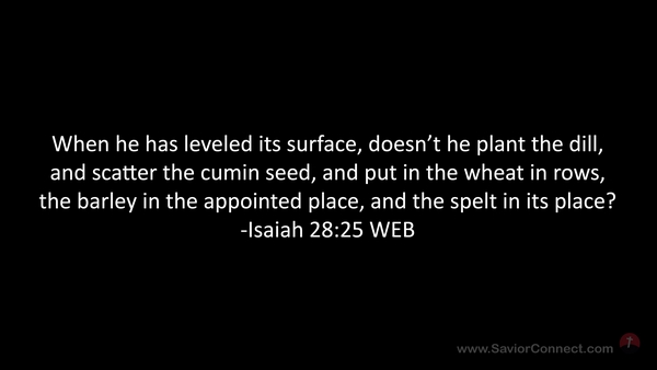 When he has leveled its surface, doesn’t he plant the dill, and scatter the cumin seed, and put in the wheat in rows, the barley in the appointed place, and the spelt in its place? -Isaiah 28:25 WEB