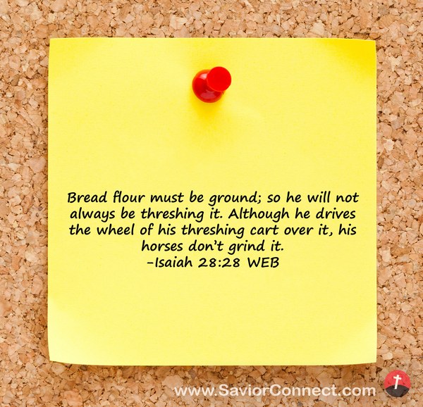 Bread flour must be ground; so he will not always be threshing it. Although he drives the wheel of his threshing cart over it, his horses don’t grind it. -Isaiah 28:28 WEB