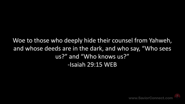 Woe to those who deeply hide their counsel from Yahweh, and whose deeds are in the dark, and who say, “Who sees us?” and “Who knows us?” -Isaiah 29:15 WEB