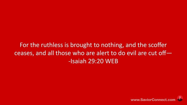 For the ruthless is brought to nothing, and the scoffer ceases, and all those who are alert to do evil are cut off— -Isaiah 29:20 WEB