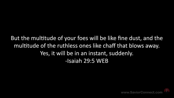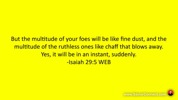 But the multitude of your foes will be like fine dust, and the multitude of the ruthless ones like chaff that blows away. Yes, it will be in an instant, suddenly. -Isaiah 29:5 WEB