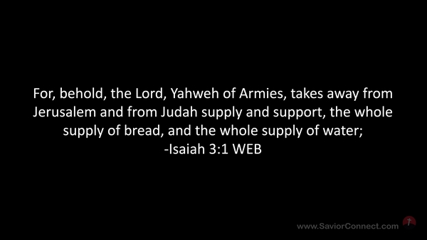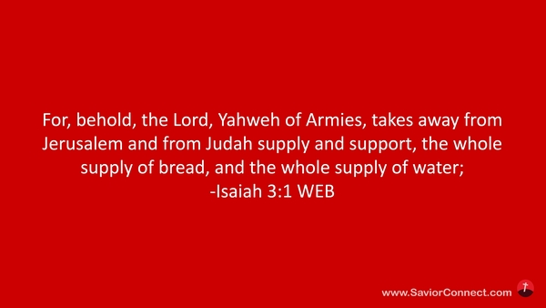 For, behold, the Lord, Yahweh of Armies, takes away from Jerusalem and from Judah supply and support, the whole supply of bread, and the whole supply of water; -Isaiah 3:1 WEB