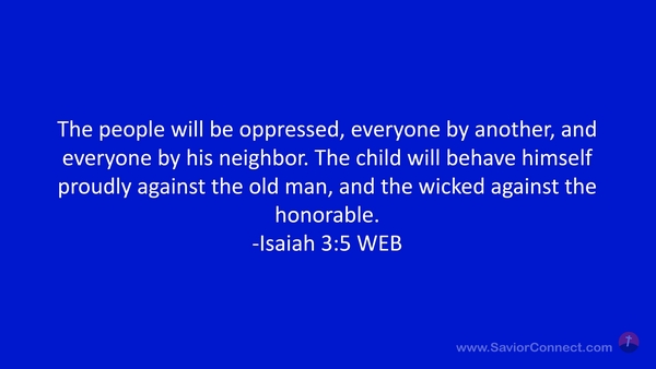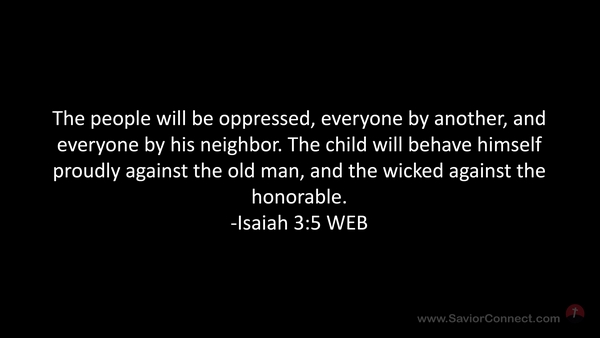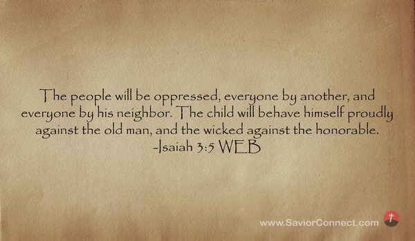 The people will be oppressed, everyone by another, and everyone by his neighbor. The child will behave himself proudly against the old man, and the wicked against the honorable. -Isaiah 3:5 WEB