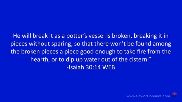 He will break it as a potter’s vessel is broken, breaking it in pieces without sparing, so that there won’t be found among the broken pieces a piece good enough to take fire from the hearth, or to dip up water out of the cistern.” -Isaiah 30:14 WEB
