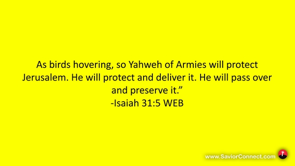 As birds hovering, so Yahweh of Armies will protect Jerusalem. He will protect and deliver it. He will pass over and preserve it.” -Isaiah 31:5 WEB