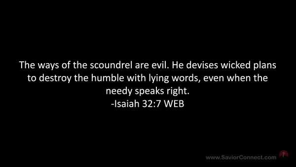 The ways of the scoundrel are evil. He devises wicked plans to destroy the humble with lying words, even when the needy speaks right. -Isaiah 32:7 WEB