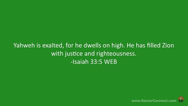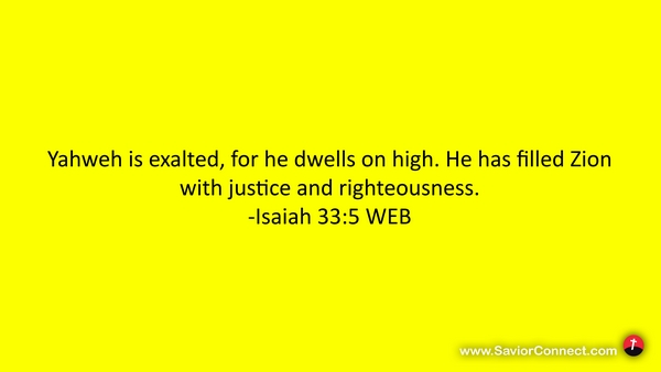Yahweh is exalted, for he dwells on high. He has filled Zion with justice and righteousness. -Isaiah 33:5 WEB