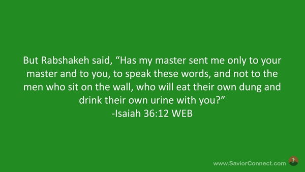 But Rabshakeh said, “Has my master sent me only to your master and to you, to speak these words, and not to the men who sit on the wall, who will eat their own dung and drink their own urine with you?” -Isaiah 36:12 WEB