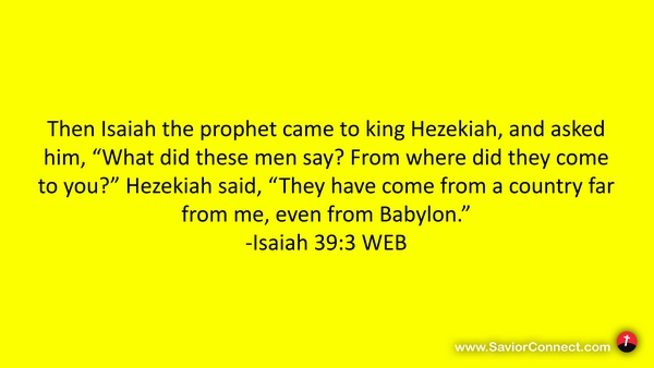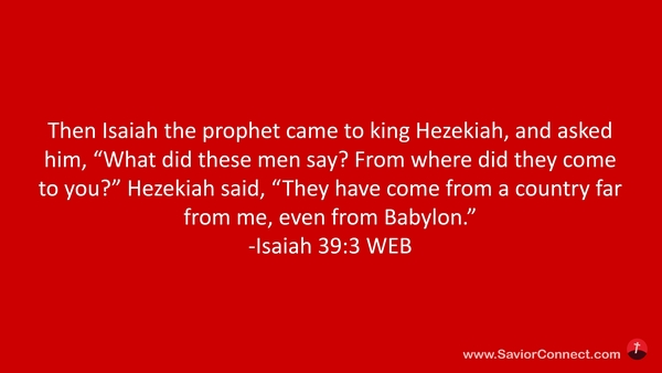 Then Isaiah the prophet came to king Hezekiah, and asked him, “What did these men say? From where did they come to you?” Hezekiah said, “They have come from a country far from me, even from Babylon.” -Isaiah 39:3 WEB