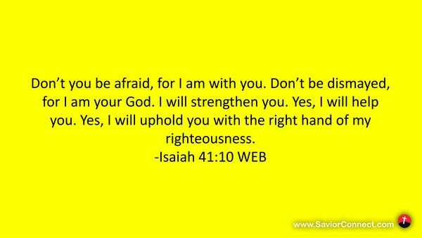 Don’t you be afraid, for I am with you. Don’t be dismayed, for I am your God. I will strengthen you. Yes, I will help you. Yes, I will uphold you with the right hand of my righteousness. -Isaiah 41:10 WEB