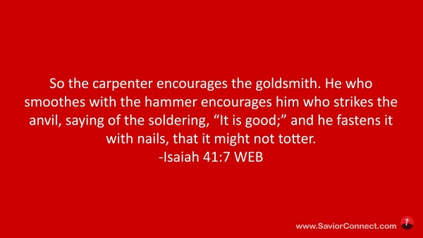 So the carpenter encourages the goldsmith. He who smoothes with the hammer encourages him who strikes the anvil, saying of the soldering, “It is good;” and he fastens it with nails, that it might not totter. -Isaiah 41:7 WEB