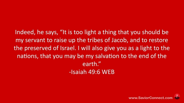 Indeed, he says, “It is too light a thing that you should be my servant to raise up the tribes of Jacob, and to restore the preserved of Israel. I will also give you as a light to the nations, that you may be my salvation to the end of the earth.” -Isaiah 49:6 WEB