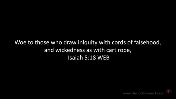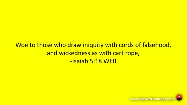 Woe to those who draw iniquity with cords of falsehood, and wickedness as with cart rope, -Isaiah 5:18 WEB