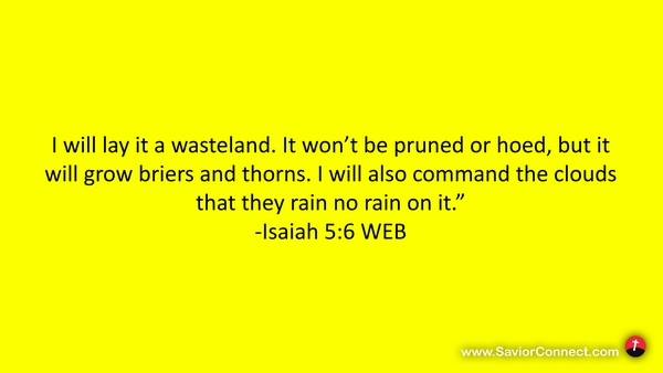 I will lay it a wasteland. It won’t be pruned or hoed, but it will grow briers and thorns. I will also command the clouds that they rain no rain on it.” -Isaiah 5:6 WEB