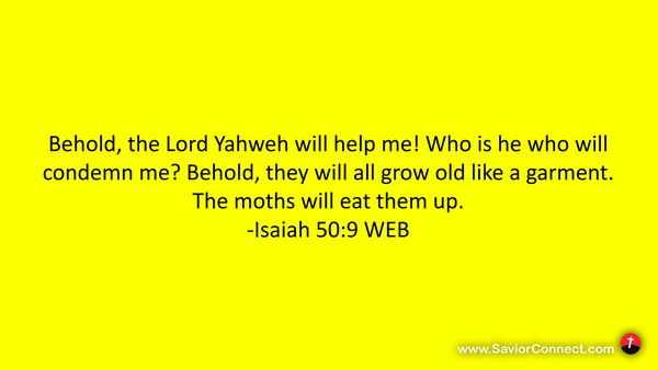 Behold, the Lord Yahweh will help me! Who is he who will condemn me? Behold, they will all grow old like a garment. The moths will eat them up. -Isaiah 50:9 WEB