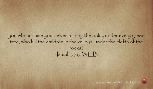 you who inflame yourselves among the oaks, under every green tree; who kill the children in the valleys, under the clefts of the rocks? -Isaiah 57:5 WEB