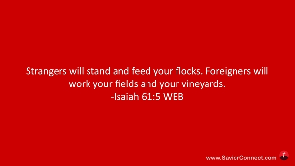 Strangers will stand and feed your flocks. Foreigners will work your fields and your vineyards. -Isaiah 61:5 WEB