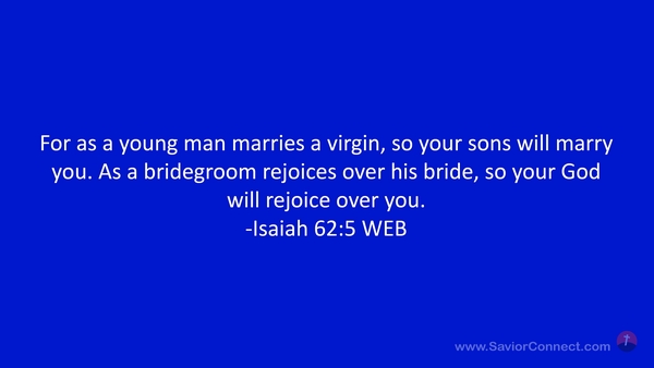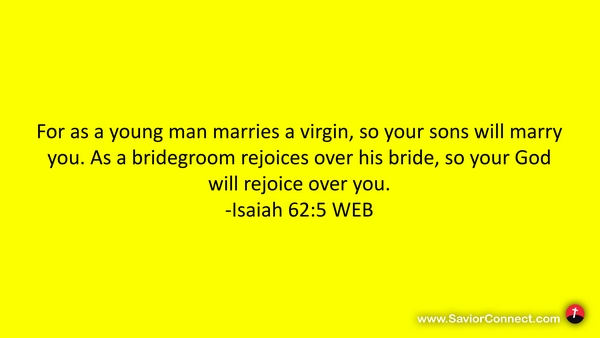 For as a young man marries a virgin, so your sons will marry you. As a bridegroom rejoices over his bride, so your God will rejoice over you. -Isaiah 62:5 WEB