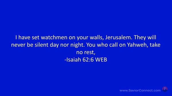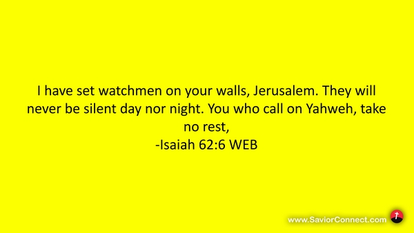 I have set watchmen on your walls, Jerusalem. They will never be silent day nor night. You who call on Yahweh, take no rest, -Isaiah 62:6 WEB