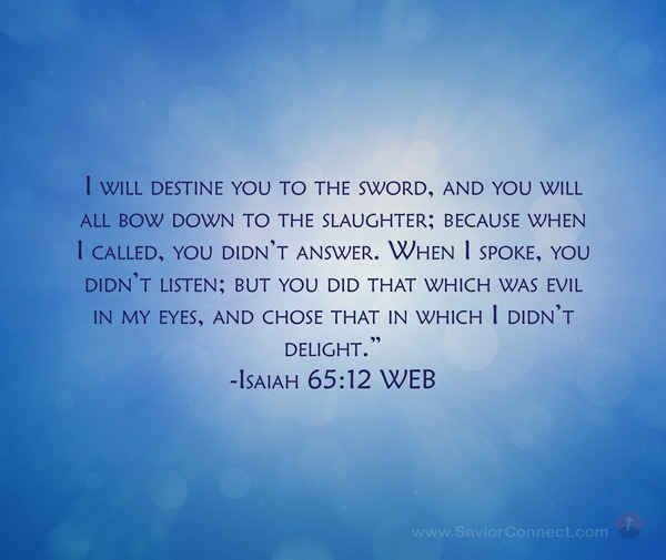 I will destine you to the sword, and you will all bow down to the slaughter; because when I called, you didn’t answer. When I spoke, you didn’t listen; but you did that which was evil in my eyes, and chose that in which I didn’t delight.” -Isaiah 65:12 WEB