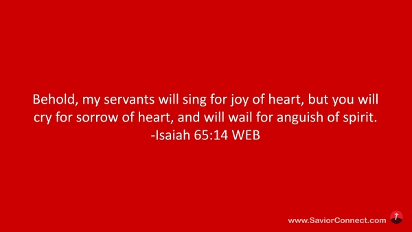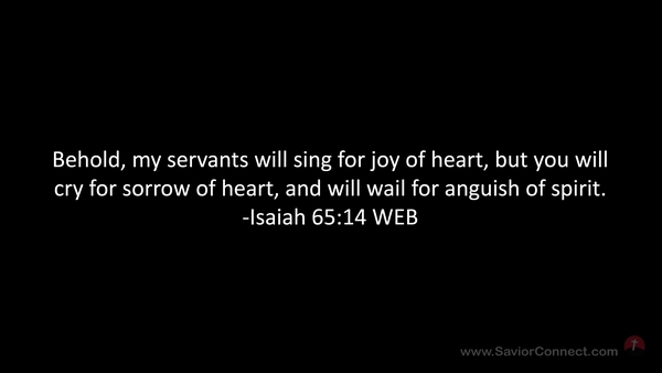 Behold, my servants will sing for joy of heart, but you will cry for sorrow of heart, and will wail for anguish of spirit. -Isaiah 65:14 WEB