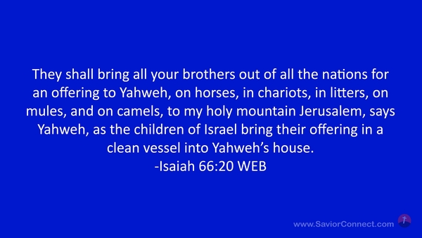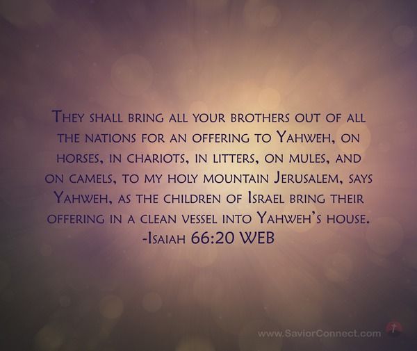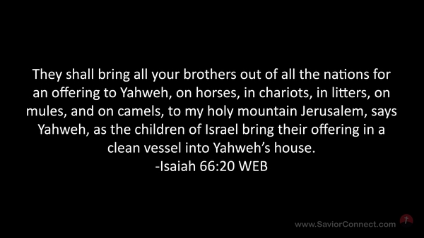 They shall bring all your brothers out of all the nations for an offering to Yahweh, on horses, in chariots, in litters, on mules, and on camels, to my holy mountain Jerusalem, says Yahweh, as the children of Israel bring their offering in a clean vessel into Yahweh’s house. -Isaiah 66:20 WEB