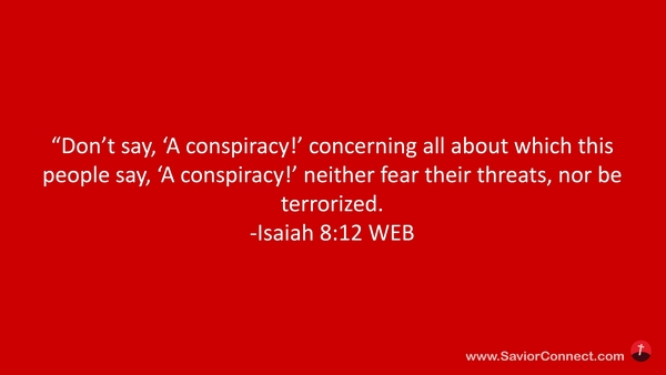 “Don’t say, 'A conspiracy!’ concerning all about which this people say, 'A conspiracy!’ neither fear their threats, nor be terrorized. -Isaiah 8:12 WEB