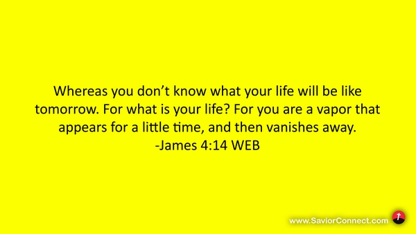 Whereas you don’t know what your life will be like tomorrow. For what is your life? For you are a vapor that appears for a little time, and then vanishes away. -James 4:14 WEB