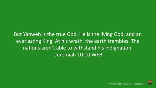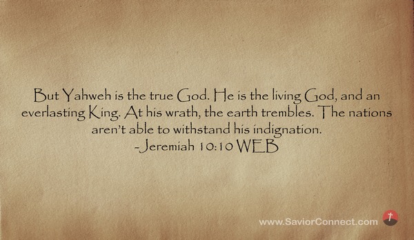 But Yahweh is the true God. He is the living God, and an everlasting King. At his wrath, the earth trembles. The nations aren’t able to withstand his indignation. -Jeremiah 10:10 WEB