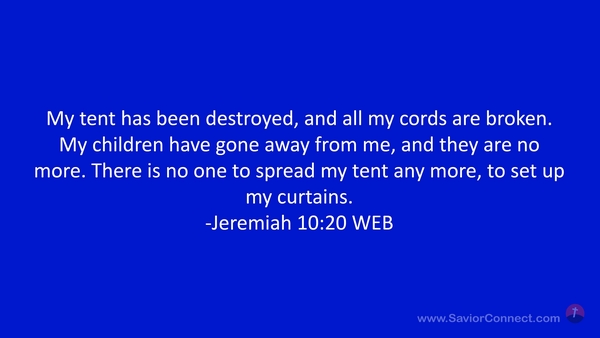 My tent has been destroyed, and all my cords are broken. My children have gone away from me, and they are no more. There is no one to spread my tent any more, to set up my curtains. -Jeremiah 10:20 WEB