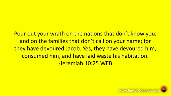 Pour out your wrath on the nations that don’t know you, and on the families that don’t call on your name; for they have devoured Jacob. Yes, they have devoured him, consumed him, and have laid waste his habitation. -Jeremiah 10:25 WEB