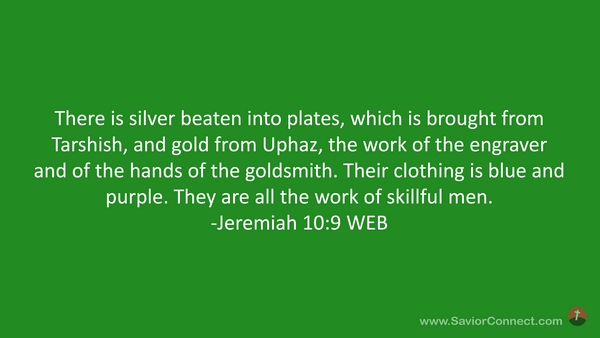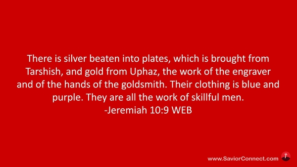 There is silver beaten into plates, which is brought from Tarshish, and gold from Uphaz, the work of the engraver and of the hands of the goldsmith. Their clothing is blue and purple. They are all the work of skillful men. -Jeremiah 10:9 WEB