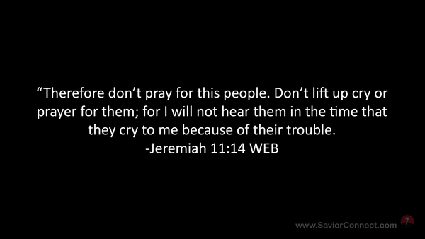 “Therefore don’t pray for this people. Don’t lift up cry or prayer for them; for I will not hear them in the time that they cry to me because of their trouble. -Jeremiah 11:14 WEB