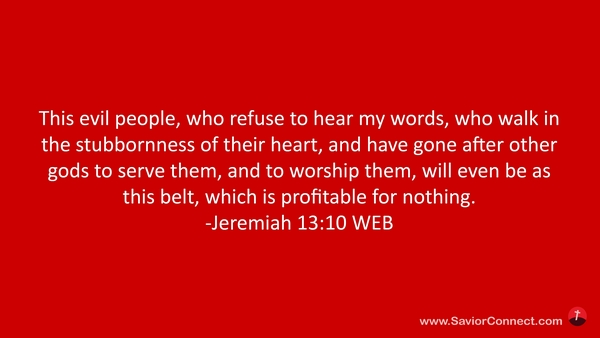 This evil people, who refuse to hear my words, who walk in the stubbornness of their heart, and have gone after other gods to serve them, and to worship them, will even be as this belt, which is profitable for nothing. -Jeremiah 13:10 WEB