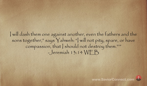 I will dash them one against another, even the fathers and the sons together,” says Yahweh: “I will not pity, spare, or have compassion, that I should not destroy them.”’” -Jeremiah 13:14 WEB