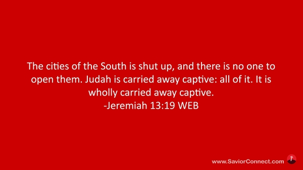 The cities of the South is shut up, and there is no one to open them. Judah is carried away captive: all of it. It is wholly carried away captive. -Jeremiah 13:19 WEB