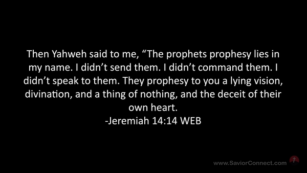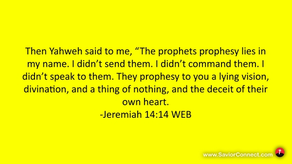 Then Yahweh said to me, “The prophets prophesy lies in my name. I didn’t send them. I didn’t command them. I didn’t speak to them. They prophesy to you a lying vision, divination, and a thing of nothing, and the deceit of their own heart. -Jeremiah 14:14 WEB