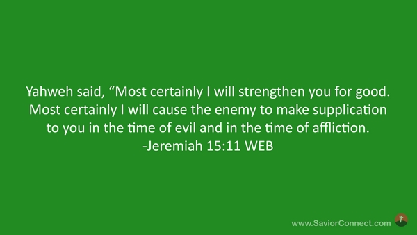 Yahweh said, “Most certainly I will strengthen you for good. Most certainly I will cause the enemy to make supplication to you in the time of evil and in the time of affliction. -Jeremiah 15:11 WEB