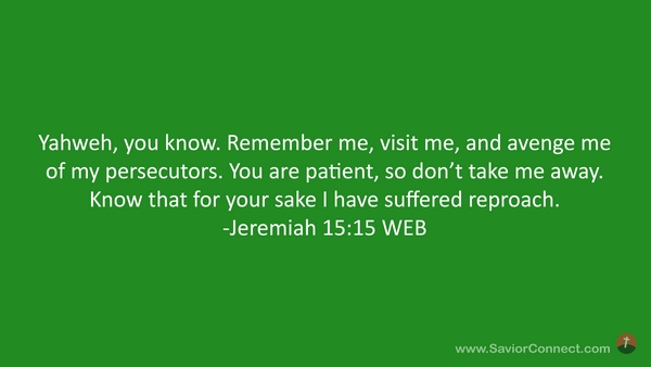 Yahweh, you know. Remember me, visit me, and avenge me of my persecutors. You are patient, so don’t take me away. Know that for your sake I have suffered reproach. -Jeremiah 15:15 WEB