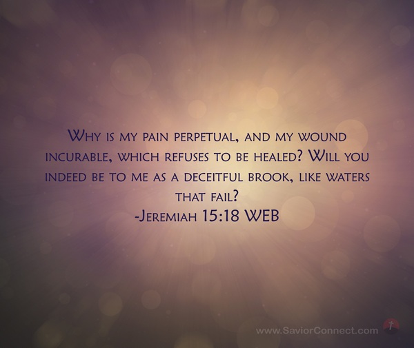 Why is my pain perpetual, and my wound incurable, which refuses to be healed? Will you indeed be to me as a deceitful brook, like waters that fail? -Jeremiah 15:18 WEB
