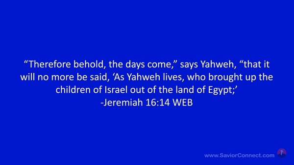 “Therefore behold, the days come,” says Yahweh, “that it will no more be said, 'As Yahweh lives, who brought up the children of Israel out of the land of Egypt;’ -Jeremiah 16:14 WEB